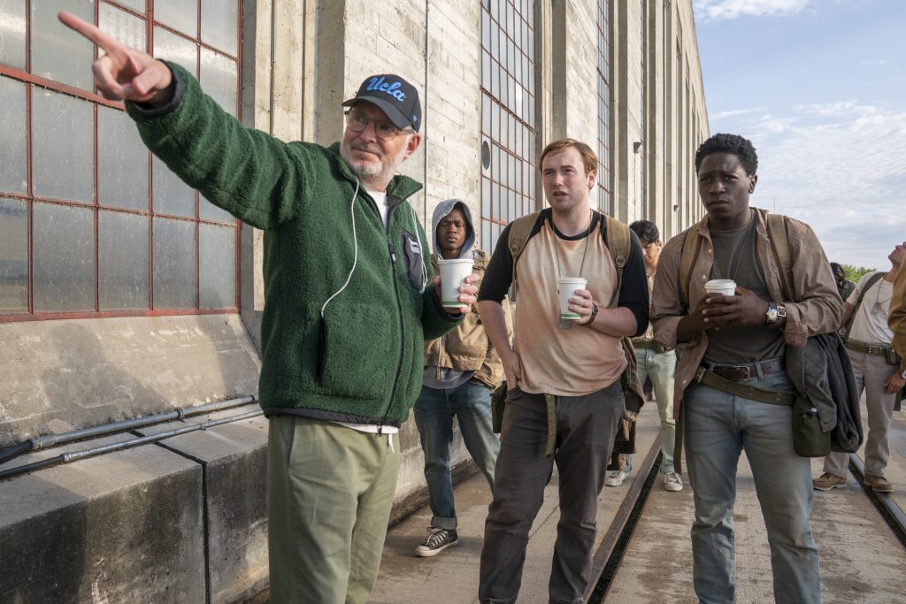 Director Francis Lawrence, Cooper Hoffman as Garraty, and David Jonsson as McVries in The Long Walk. Photo Credit: Murray Close/Lionsgate
